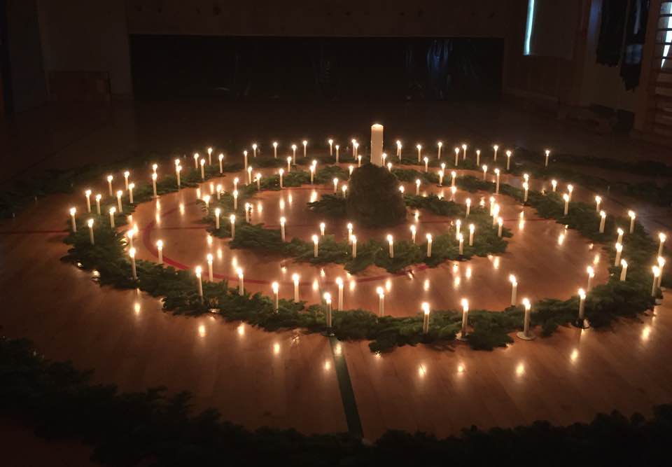 Kvelden før, i gymsalen, lager vi en stor spiral av granbar og små lysestaker på gulvet. Så kommer dagen, og tidlig på morgenen kommer den yngste klassen inn og tenner de første lysene. Så går det slag i slag, og på slutten av dagene har alle elever og lærere tent sine lys. Salen bader i tente lys, så inderlig og vakkert at man nesten mister pusten.